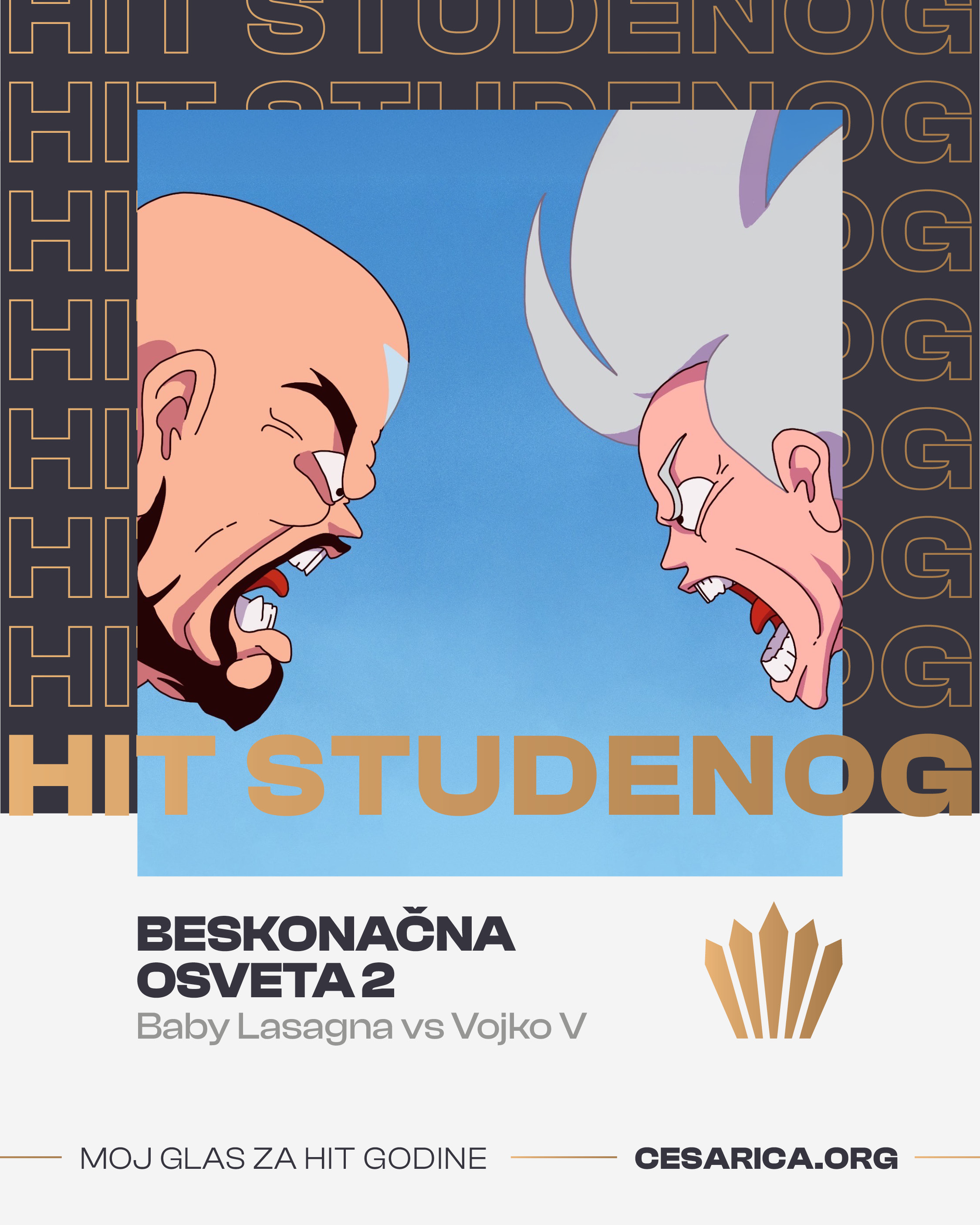 Publika je odlučila da Cesarica za Hit mjeseca studenog odlazi u ruke Baby Lasagne i Vojka V za pjesmu „Beskonačna osveta 2“, nastavak njihove epske glazbene “razmjene vatri” koja je obilježila protekli mjesec domaće glazbene scene.